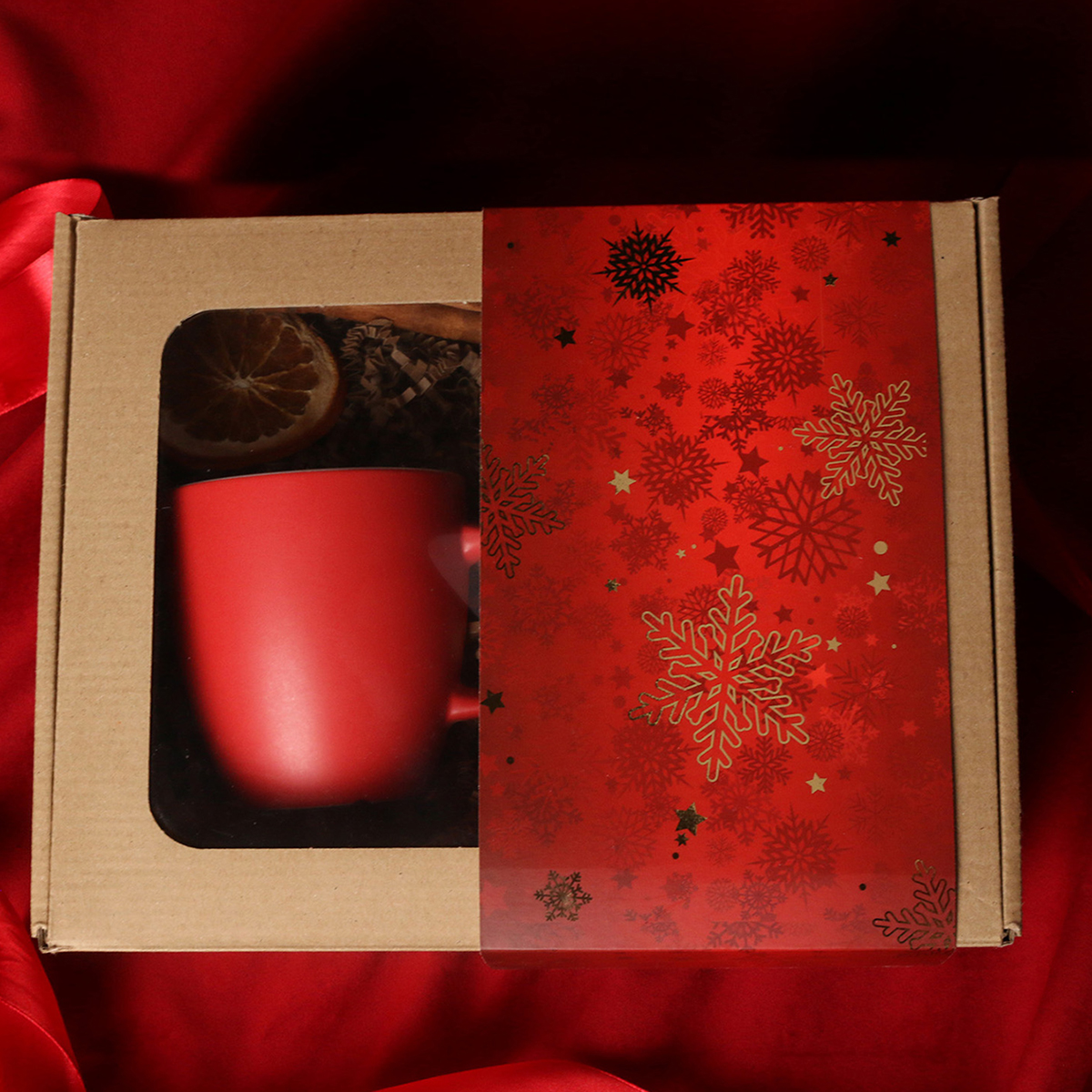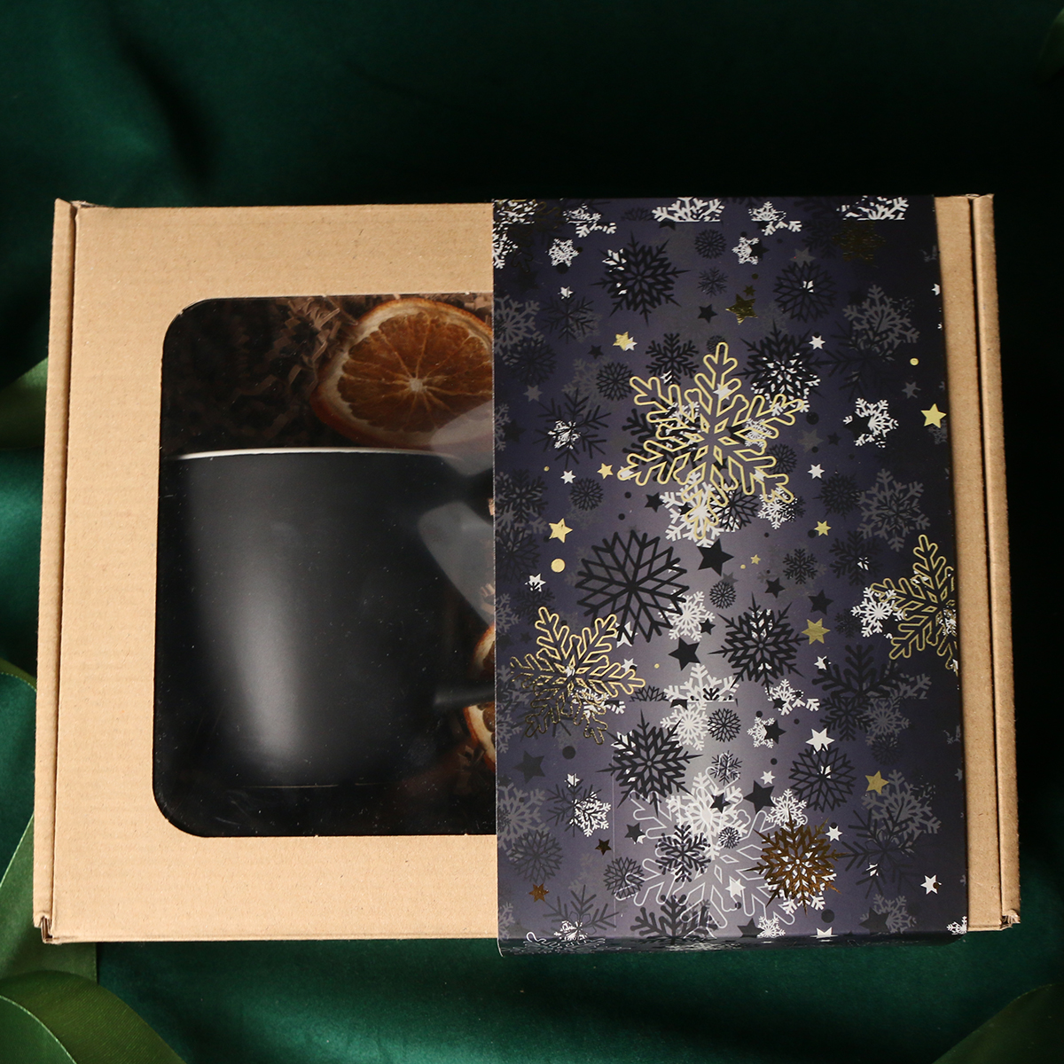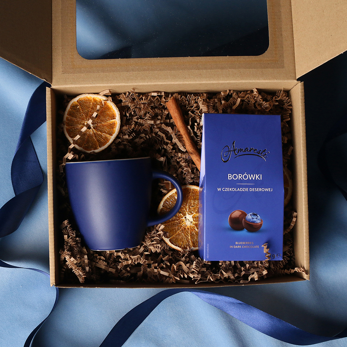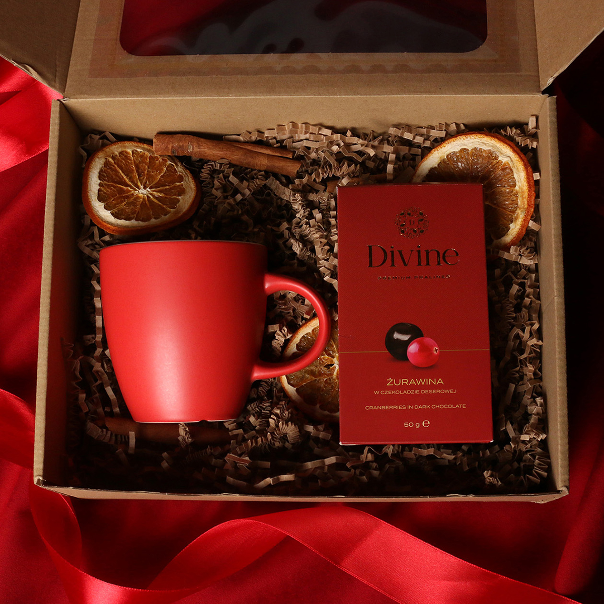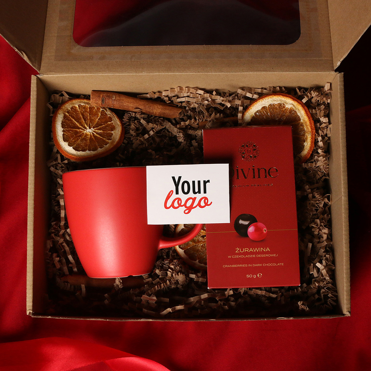 The set includes: Fiord mug red-white / navy-white / black-white with the option of customization, Divine Pralines – cranberries in chocolate (red) / blueberries in chocolate (navy) / orange peel in chocolate (black). All packed in a stylish eco cardboard box with a window. Additional customization options: print on the mug, company logo tag, ribbon or sleeve with a winter theme enriched with gold stamping.