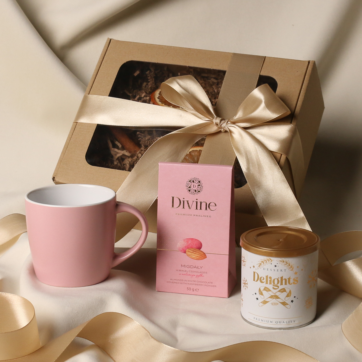 The set includes: Handy Velvet mug rose pink-white / baby blue-white / Handy Cool gray-white with the option of customization, Divine Pralines – almonds in chocolate with raspberry powder (pink) / almonds in chocolate with coconut (blue) / orange peel in dark chocolate (gray), Dessert Delights – blackcurrants in white chocolate with raspberry powder packed in a tube with a winter theme. All packed in a stylish eco cardboard box with a window. Additional customization options: print on the mug, company logo tag, ribbon or sleeve with a winter theme enriched with gold stamping.