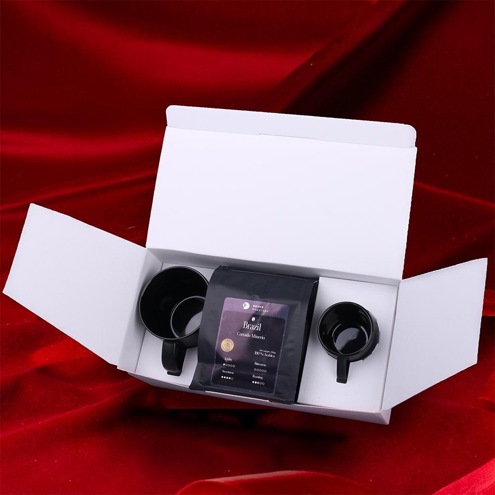 One of the top sales hits – the black matte Handy Supreme mug accompanied by its smaller version, Small, perfect for espresso, and carefully selected Arabica Brazil Cerrado Mineiro coffee beans. The set is packed in dedicated eco-friendly Merry packaging and finished with an elegant personalized band. THE PRESENTED DECORATION IS FOR ILLUSTRATION PURPOSES ONLY AND IS NOT INCLUDED IN THE PRODUCT PRICE. THE SET IS AVAILABLE IN DEDICATED MERRY PACKAGING WITH A SELECTED DECORATION OPTION.