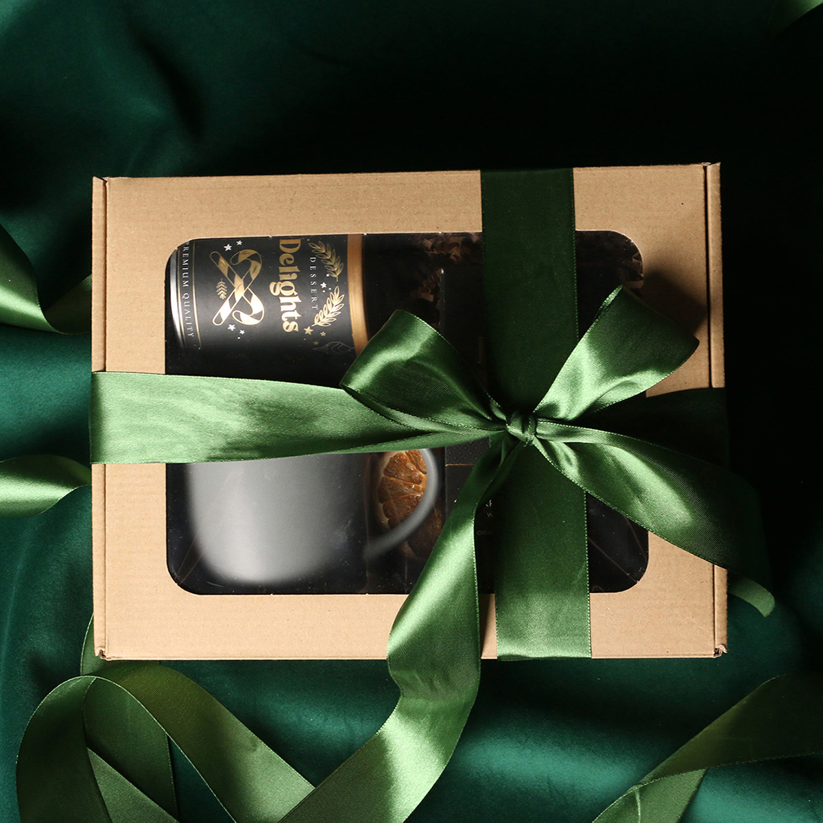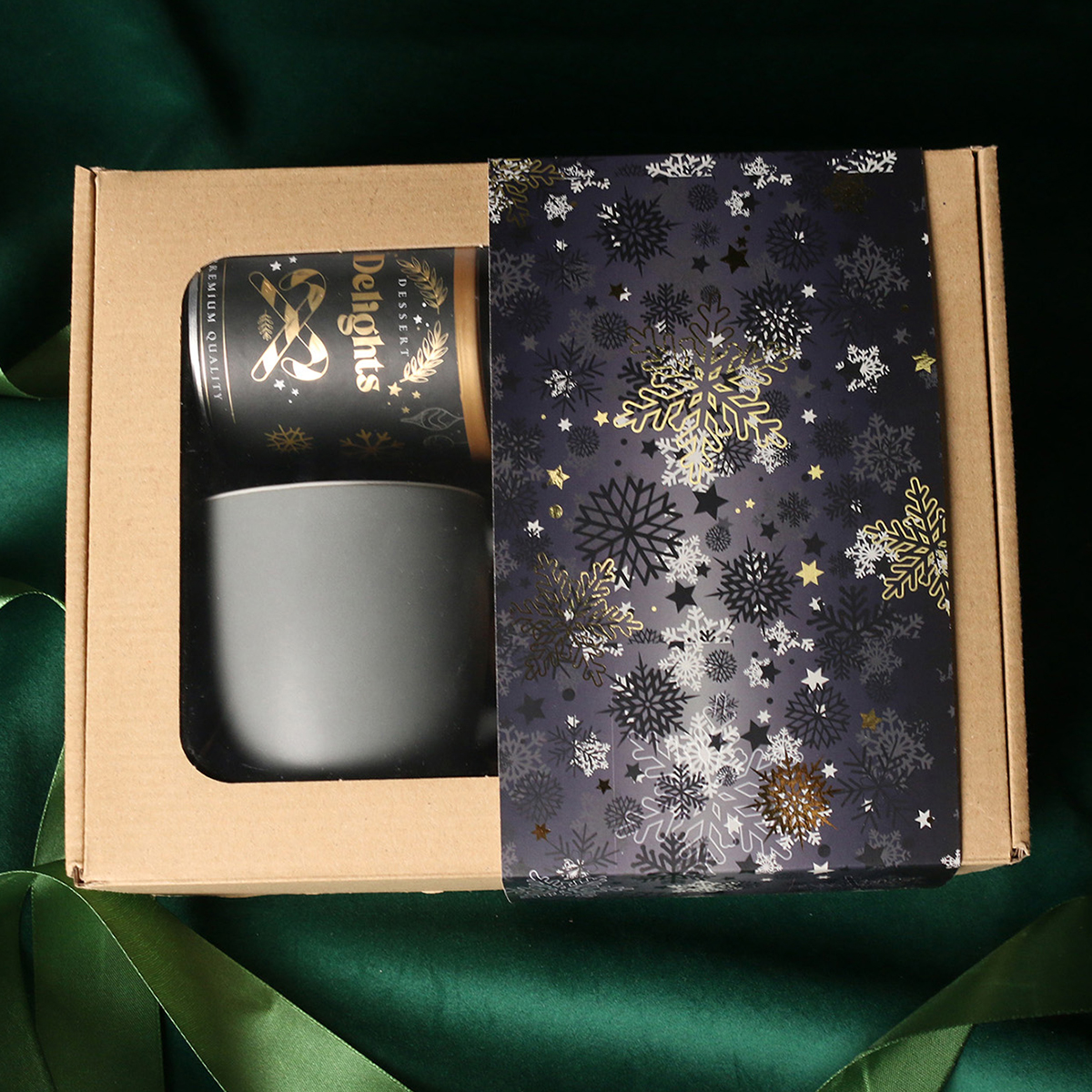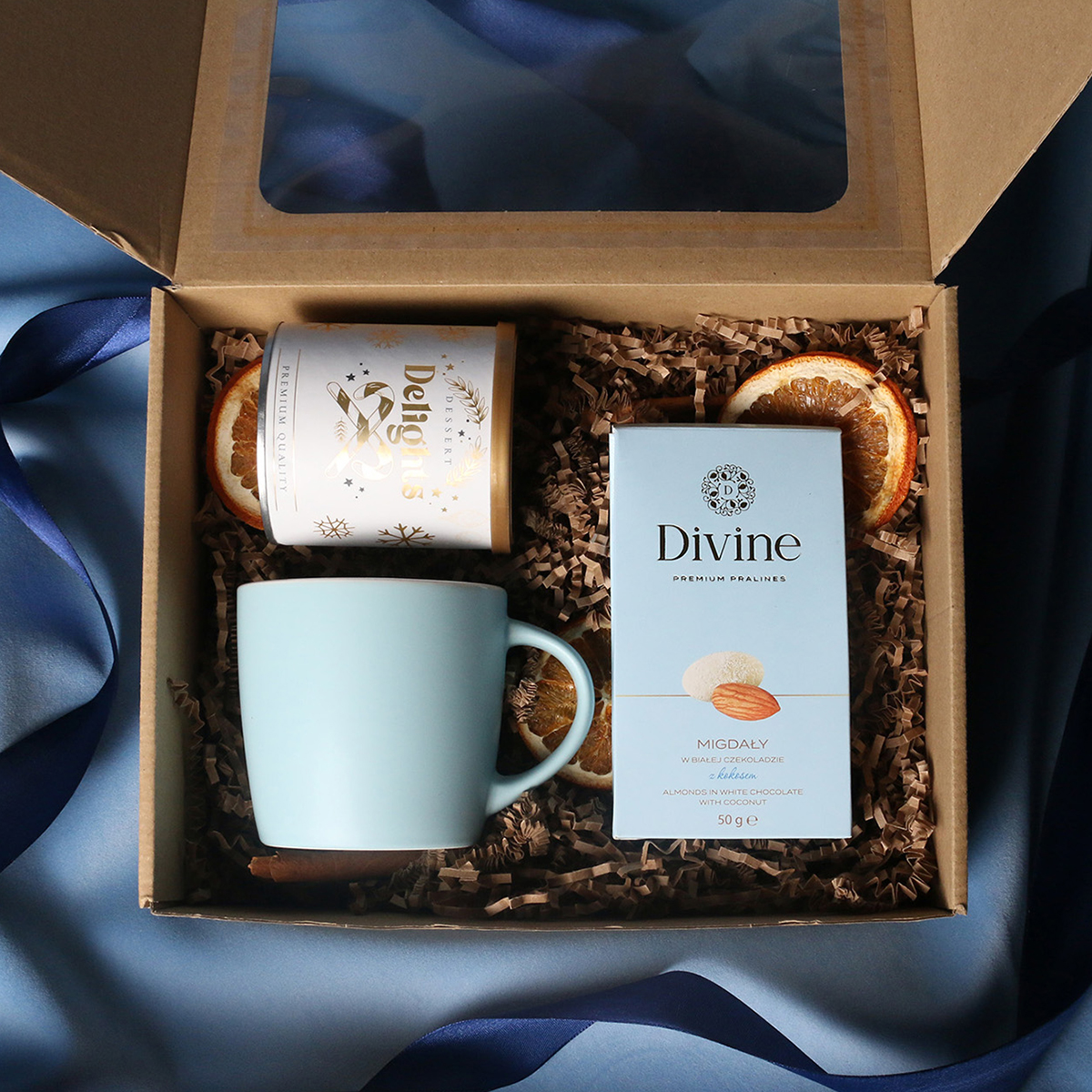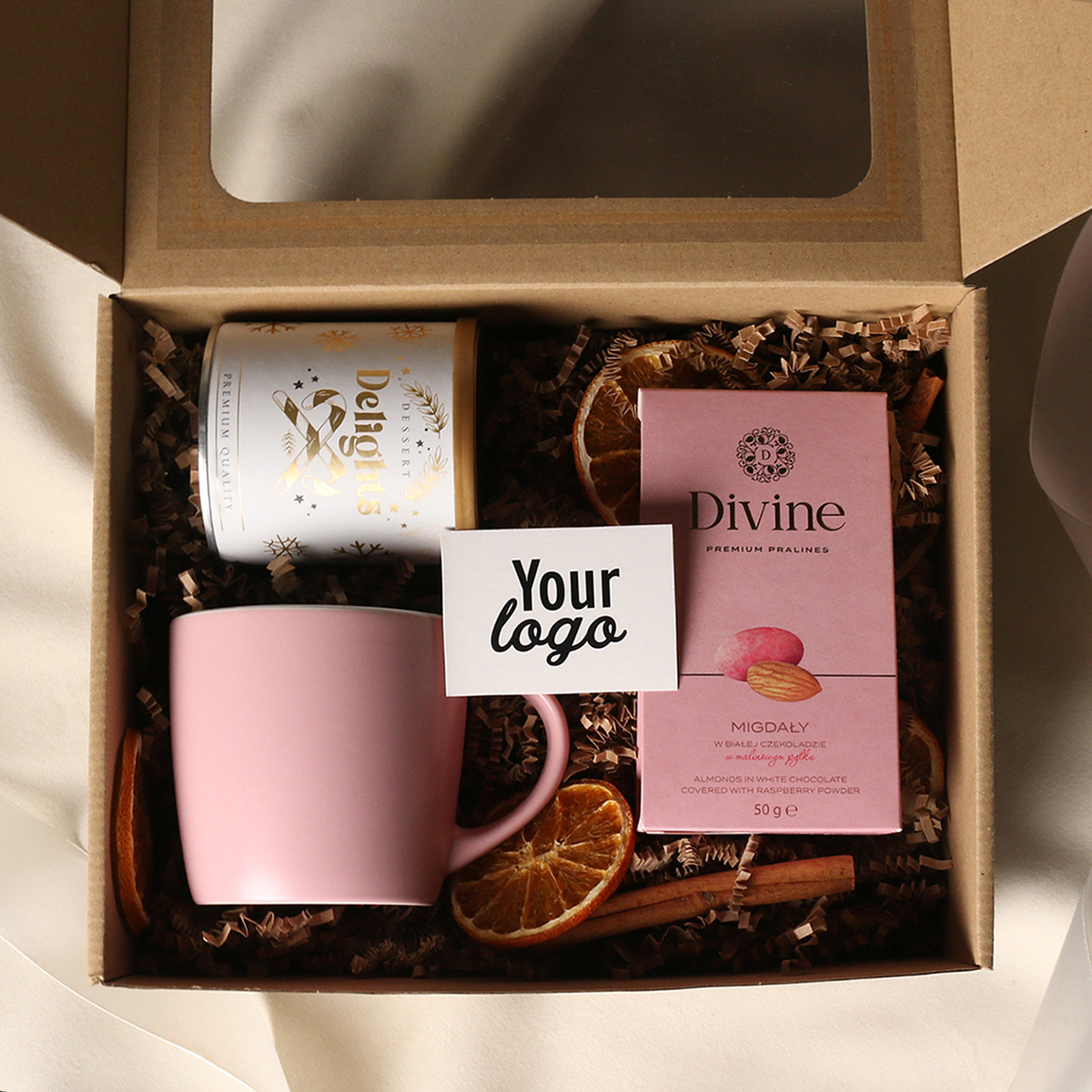 The set includes: Handy Velvet mug rose pink-white / baby blue-white / Handy Cool gray-white with the option of customization, Divine Pralines – almonds in chocolate with raspberry powder (pink) / almonds in chocolate with coconut (blue) / orange peel in dark chocolate (gray), Dessert Delights – blackcurrants in white chocolate with raspberry powder packed in a tube with a winter theme. All packed in a stylish eco cardboard box with a window. Additional customization options: print on the mug, company logo tag, ribbon or sleeve with a winter theme enriched with gold stamping.